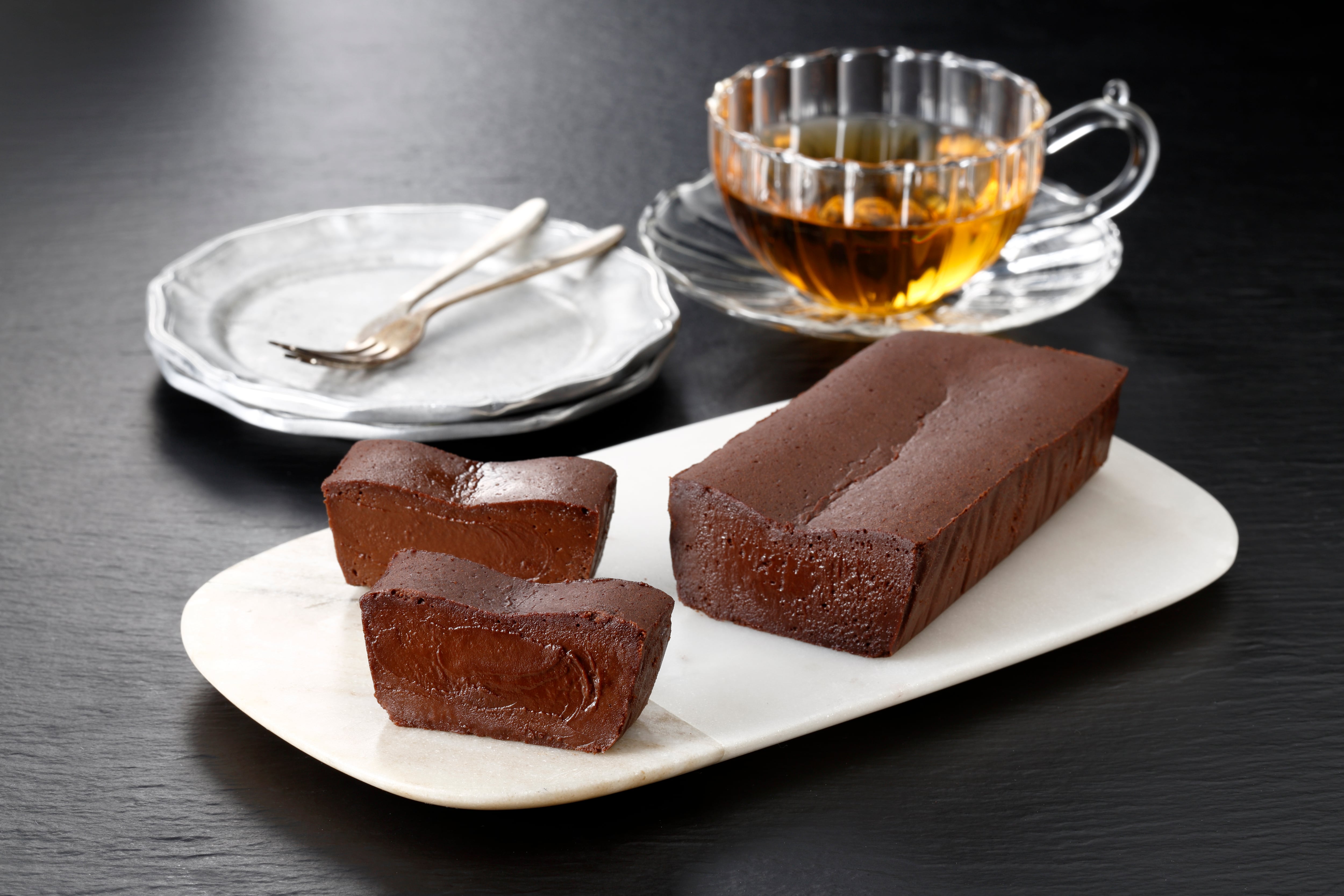 「土屋シェフのご褒美ガトーショコラ」は、土屋シェフこだわりのクーベルチュールチョコレートを3種類使用して、深みのある味わいに。小麦粉を使わずに低温でじっくり火を通すことで、しっとりなめらかな口当たりに仕上げました。舌の上でゆっくりと溶かしながら、カカオ本来の風味を楽しんでください。